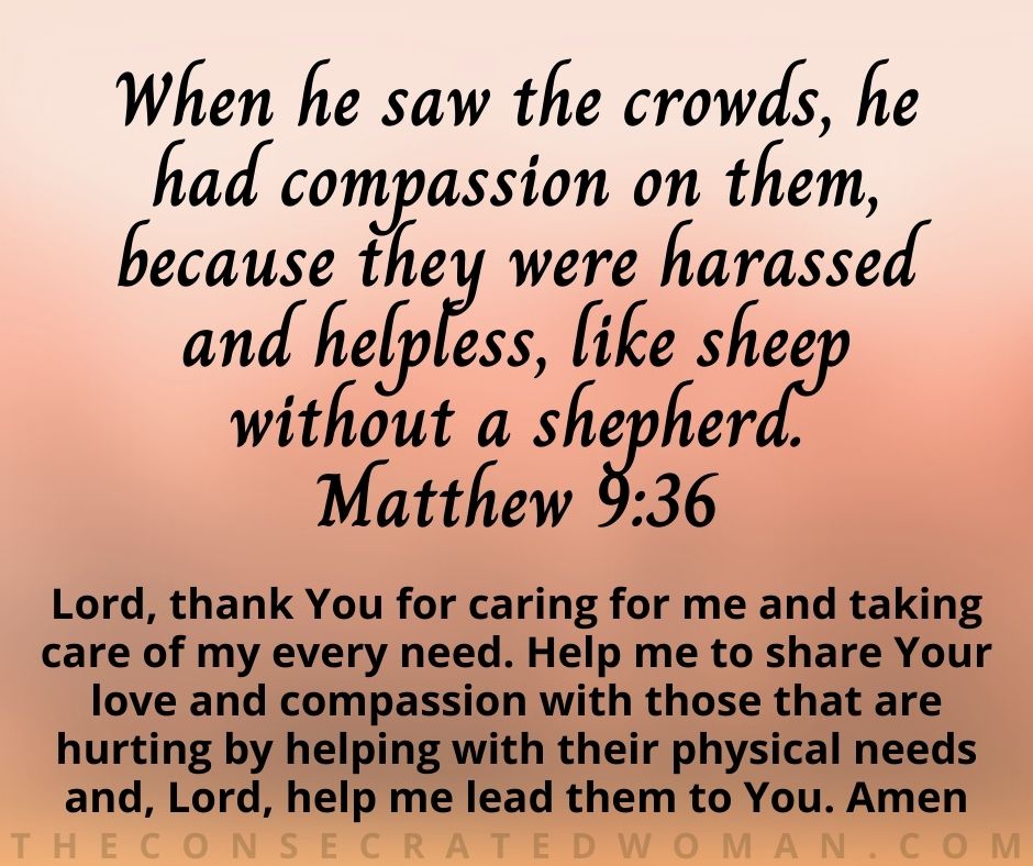 Lord, thank You for caring for me and taking care of my every need. Help me to share Your love and compassion with those that are hurting by helping with their physical needs and, Lord, help me lead them to You. Amen