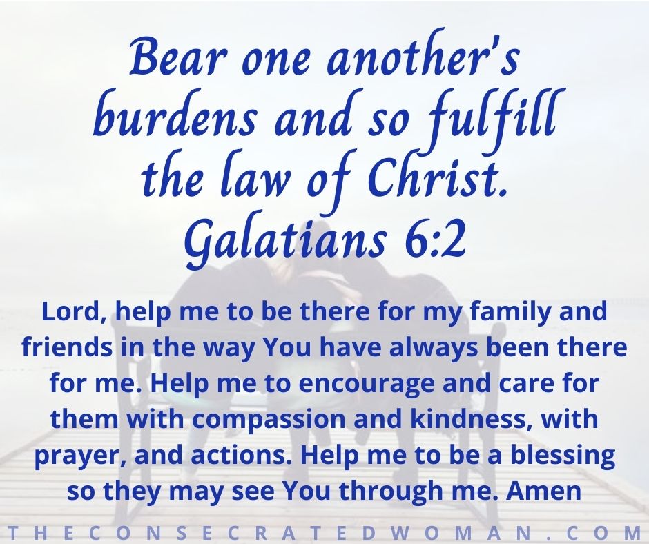 Lord, help me to be there for my family and friends in the way You have always been there for me. Help me to encourage and care for them with compassion and kindness, with prayer, and actions. Help me to be a blessing so they may see You through me. Amen
