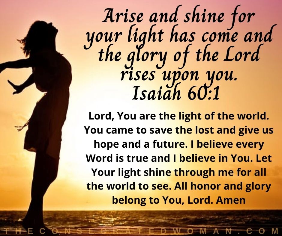 Arise and shine for your light has come and the glory of the Lord rises upon you.