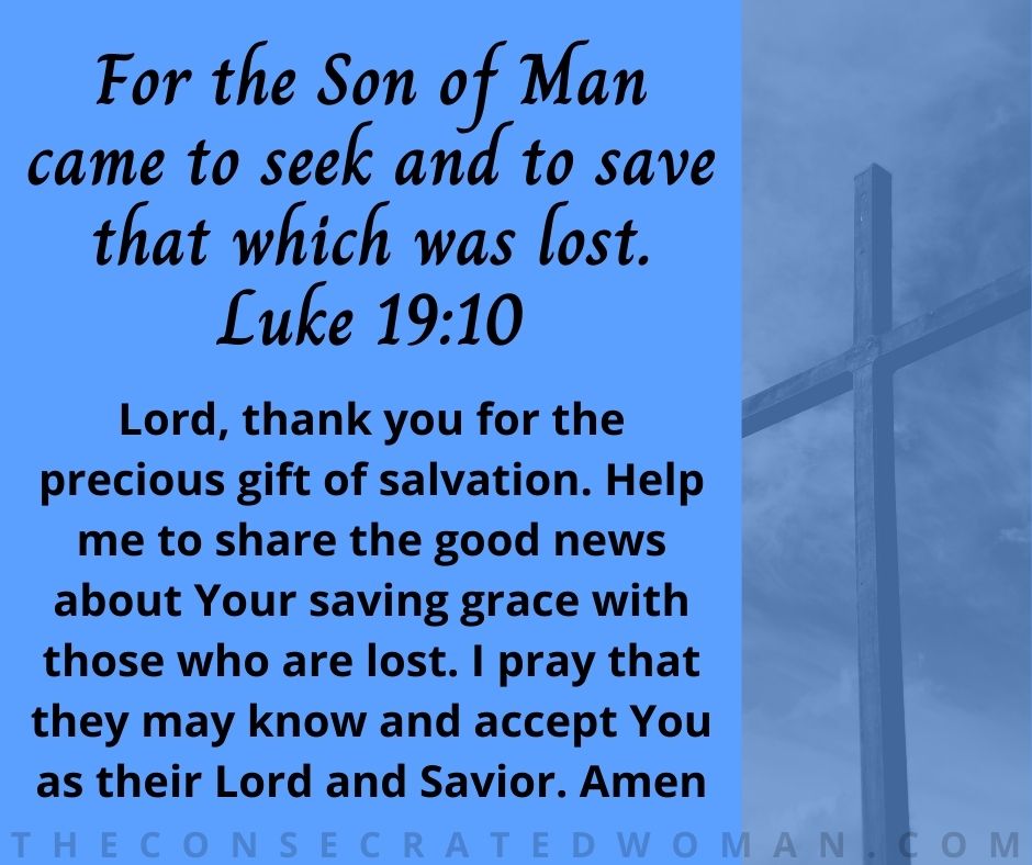 Lord, thank you for the precious gift of salvation. Help me to share the good news about Your saving grace with those who are lost. I pray that they may know and accept You as their Lord and Savior. Amen