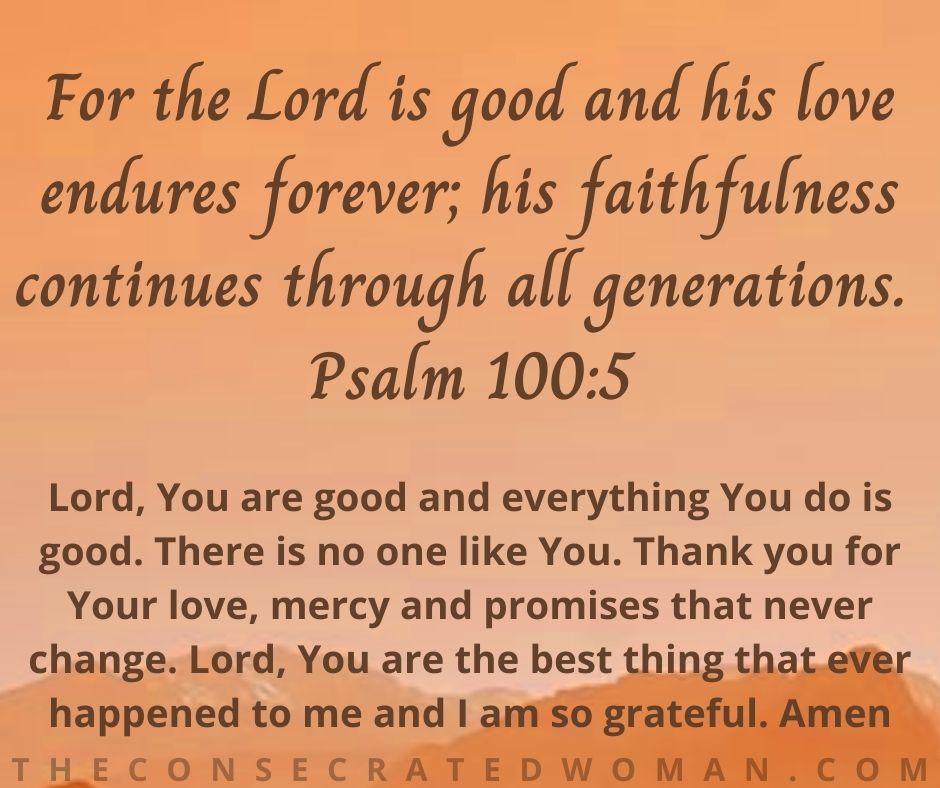 God is good and His love for us is forever, not because of anything we have done or anything we will ever do, but because it’s who He is. His lovingkindness for His people will continue forever because He is good. His timing is good, His mercy and grace are good, everything He does is good. His truth continues for all generations and He is faithful in keeping His promises. We can always count on Him because He never changes, even when we are faithless, He remains faithful. Man may fail you but God never will.