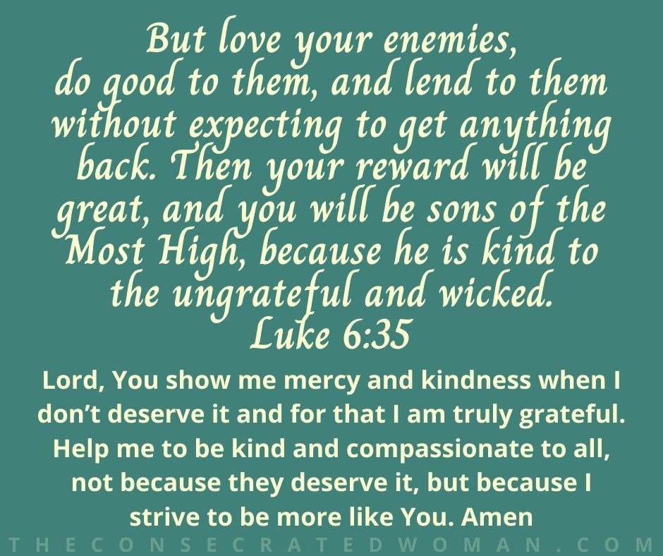 God commands us to love our enemies and do good to them. For some, these lessons may be harder than others, but if we are grounded in God’s love and mercy, we can move past our human nature and into the spiritual characteristics of Christ. Our heavenly Father has shown us great love and mercy and expects us to be kind even to those who are ungrateful and wicked, not because they deserve it, but because we are striving to live a life that pleases God.