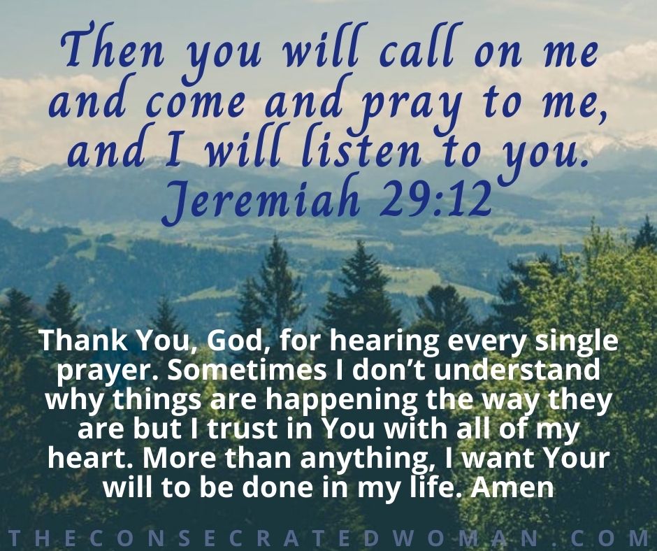 Thank You, God, for hearing every single prayer. Sometimes I don’t understand why things are happening the way they are but I trust in You with all of my heart. More than anything, I want Your will to be done in my life. Amen