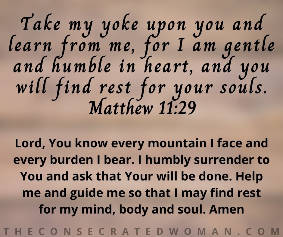Lord, You know every mountain I face and every burden I bear. I humbly surrender to You and ask that Your will be done. Help me and guide me so that I may find rest for my mind, body and soul. Amen
