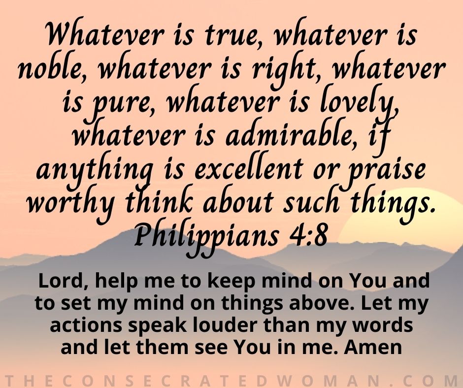 Whatever is true, whatever is noble, whatever is right, whatever is pure, whatever is lovely, whatever is admirable, if anything is excellent or praise worthy think about such things.