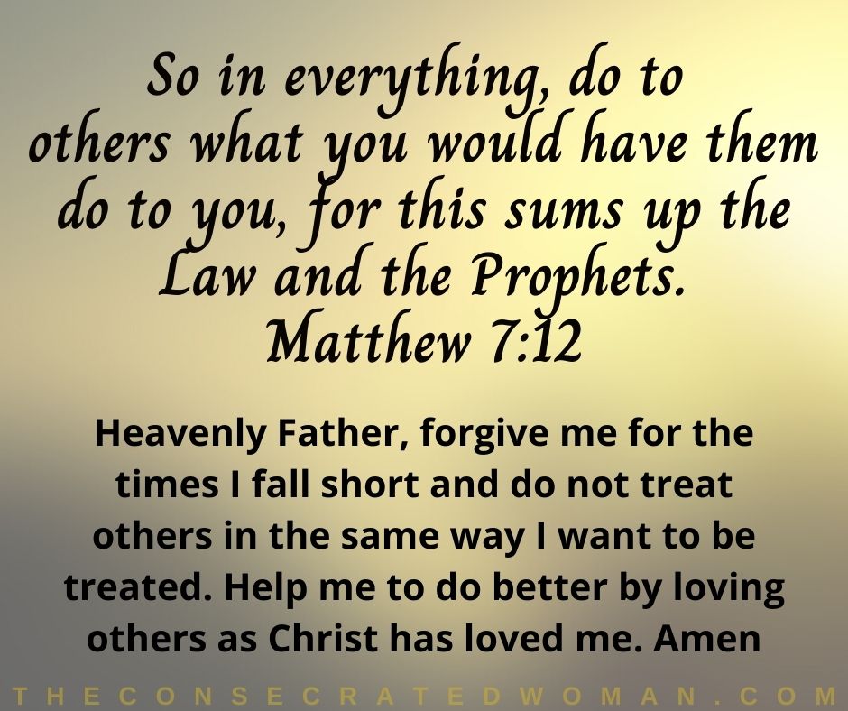 Heavenly Father, forgive me for the times I fall short and do not treat others in the same way I want to be treated. Help me to do better by loving others as Christ has loved me. Amen