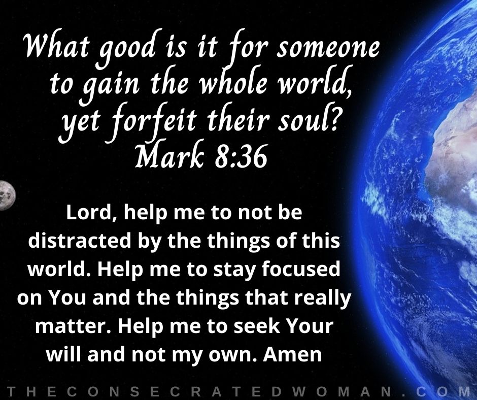 Lord, help me to not be distracted by the things of this world. Help me to stay focused on You and the things that really matter. Help to seek Your will and not my own. Amen
