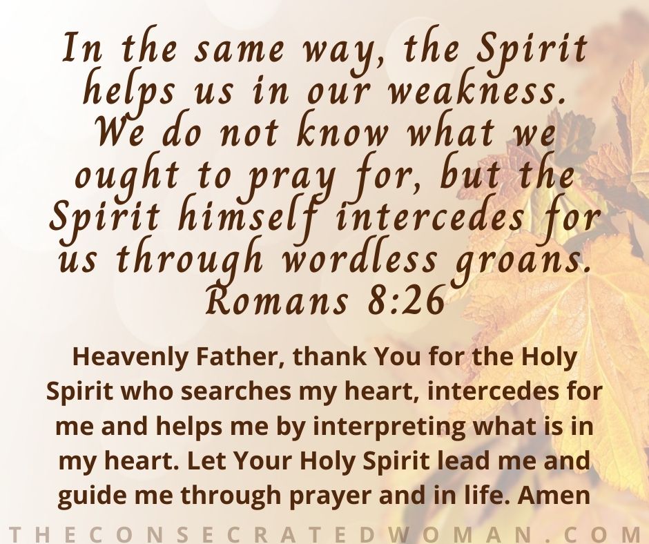 Even on our best days we may struggle to find the words to pray. We may lack the wisdom to know exactly what we need but the Holy Spirit is there to help us. And on our worse days, we may come before God feeling defeated and overwhelmed to the point where words cannot convey what we want or need to say. Tears may stream down our face as we humbly come before the almighty God. It’s okay if we don’t have the right words or any words at all. The Holy Spirit searches our heart, will intercede for us and help us by interpreting what is in our heart. The Holy Spirit that lives in us also helps us to remember God’s promises, reminds us of God’s love, acts as a comforter in our suffering and gives us strength. Let the Holy Spirit work in you, lead you and guide you through prayer and in life.