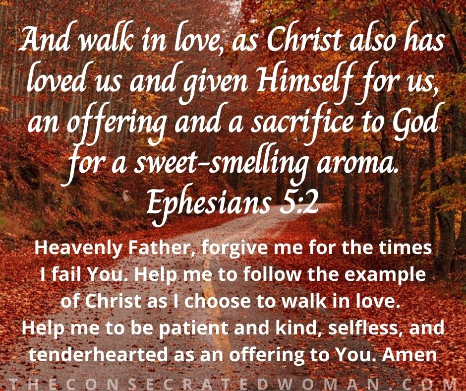 Walk in love by following the example of Jesus Christ. He loved us so much He gave all He had so we could be saved. Be imitators of Christ and let everything you do come from a place of love. To walk in love is not just to talk about it, but to actually apply it to our daily life by not letting our circumstances dictate our attitude. We can choose how we respond to situations in life and although we can never love as much as God loves us we can try our best to be patient and selfless. We can be kind to one another, tenderhearted, forgiving one another, even as God in Christ forgave you. (Ephesians 4:32) We can also give our time and be of service to others for the glory of God. As we walk through our days in love, may our continued praises and thanksgiving be an offering and a sweet aroma to the Lord.