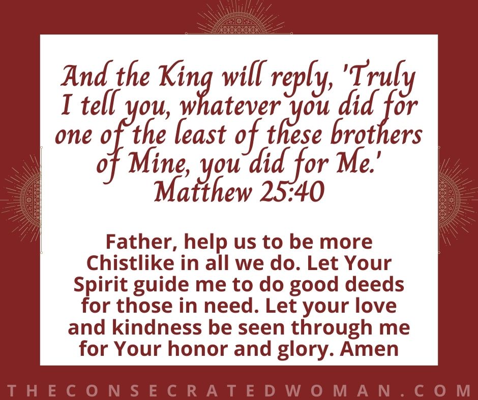 Father, help us to be more Chistlike in all we do. Let Your Spirit guide me to do good deeds for those in need. Let your love and kindness be seen through me for Your honor and glory. Amen