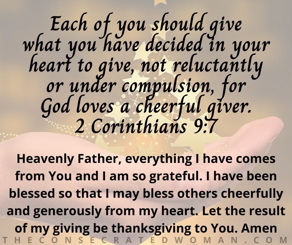 Heavenly Father, everything I have comes from You and I am so grateful. I have been blessed so that I may bless others cheerfully and generously from my heart. Let the result of my giving be thanksgiving to You. Amen