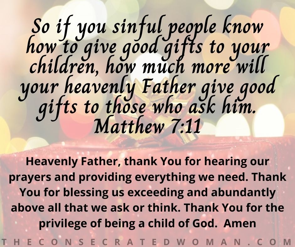 Doesn’t it make you feel happy when you give your children the gifts they’ve asked for? Just think about how much more your heavenly Father wants to give you good gifts from the riches of His glory. God loves you and it makes Him happy to bless you with the desires of your heart when you delight yourself in Him. God already knows what you want, what you need and what is fit for you before you ask, but He still wants you to come to Him in faith and ask. God hears your prayers and if you believe, you will receive whatever you ask for in prayer according to His will.
