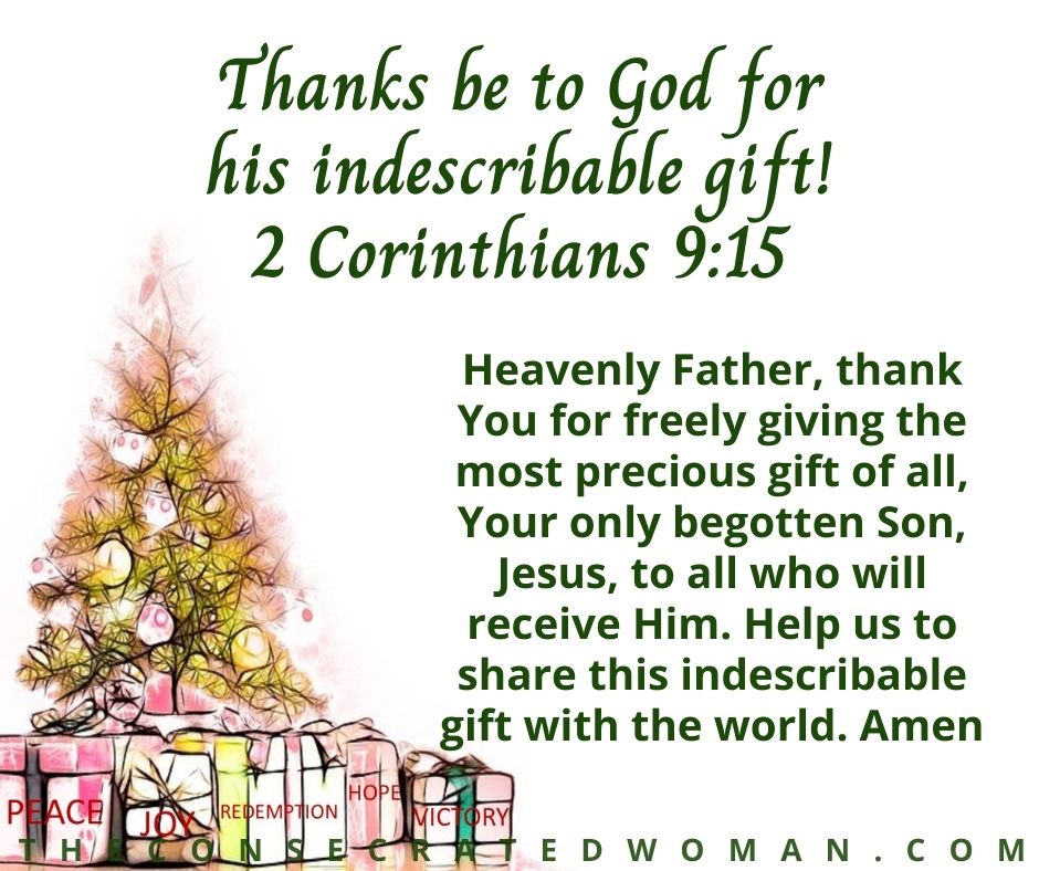 Heavenly Father, thank You for freely giving the most precious gift of all, Your only begotten Son, Jesus, to all who will receive Him. Help us to share this indescribable gift with the world. Amen