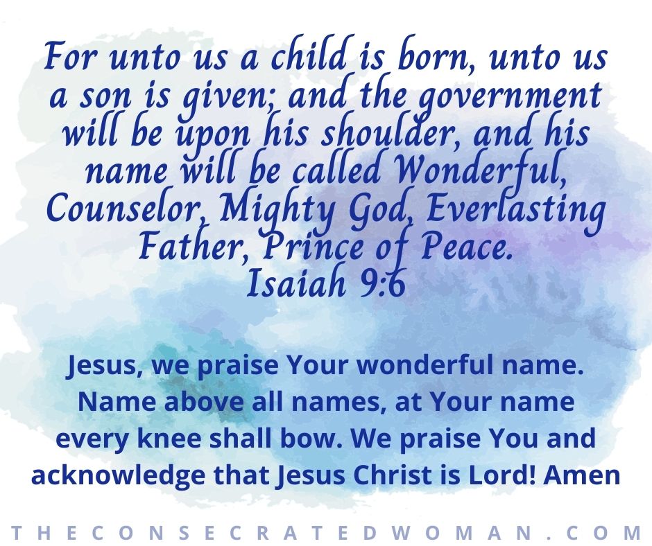 The Messiah, born to a virgin, is a gift from God, His only Son came to save mankind. He is described as Wonderful because of His glorious nature, Counselor because He knew God’s plan and revealed it to all of mankind. He is called Mighty God because He is God as well as man, Everlasting Father of all believers. He is the Prince of Peace who purchased peace between God and men when He died on the cross for our sins. God gave Him the name that is above every name, that at the name of JESUS every knee should bow, in heaven and on earth and under the earth, and every tongue acknowledge that Jesus Christ is Lord, to the glory of God the Father. (Philippians 2:9-11)