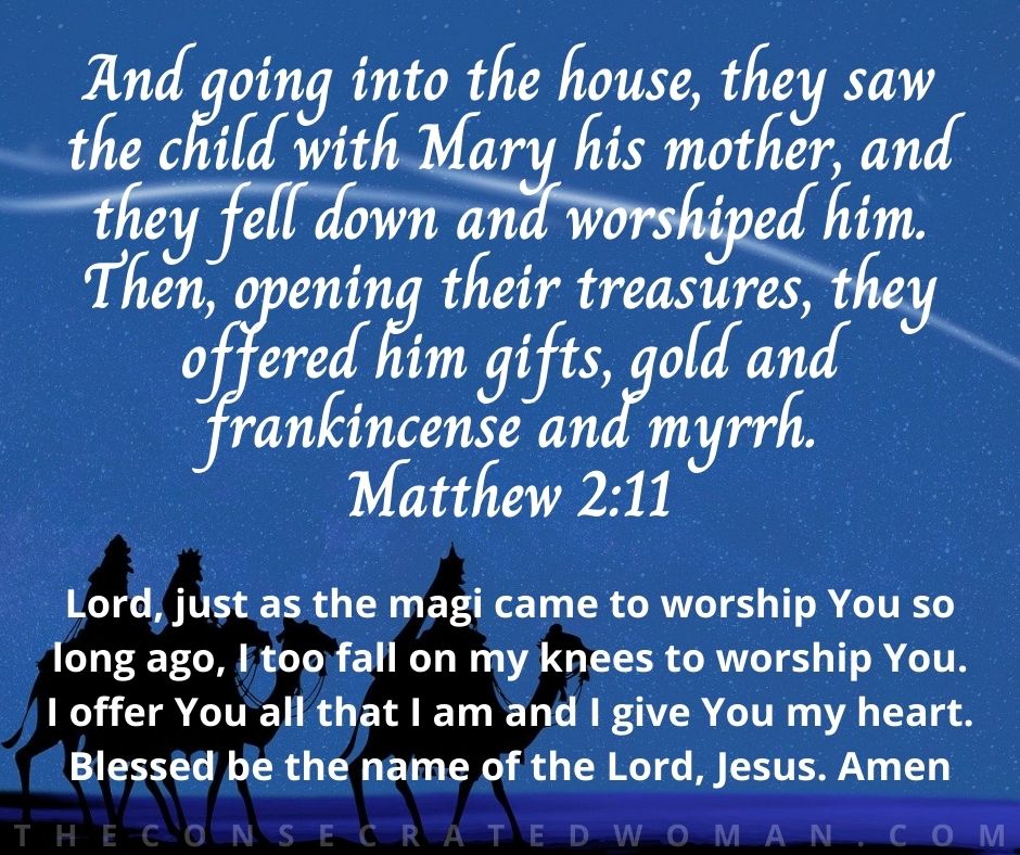 Lord, just as the magi came to worship You so long ago, I too fall on my knees to worship You. I offer You all that I am and I give You my heart. Blessed be the name of the Lord, Jesus. Amen