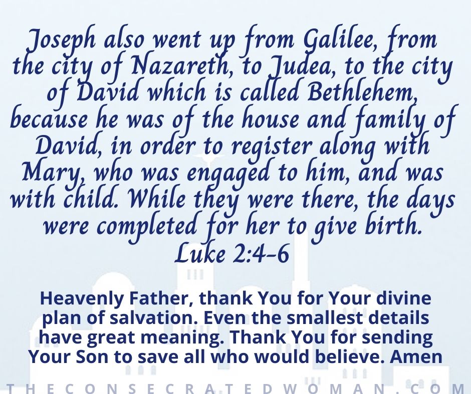 Joseph also went up from Galilee, from the city of Nazareth, to Judea, to the city of David which is called Bethlehem, because he was of the house and family of David, in order to register along with Mary, who was engaged to him, and was with child. While they were there, the days were completed for her to give birth.
