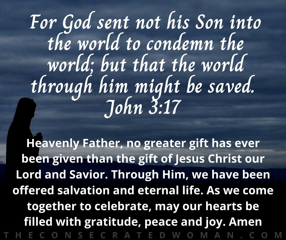 Heavenly Father, no greater gift has ever been given than the gift of Jesus Christ our Lord and Savior. Through Him, we have been offered salvation and eternal life. As we come together to celebrate, may our hearts be filled with gratitude, peace and joy. Amen