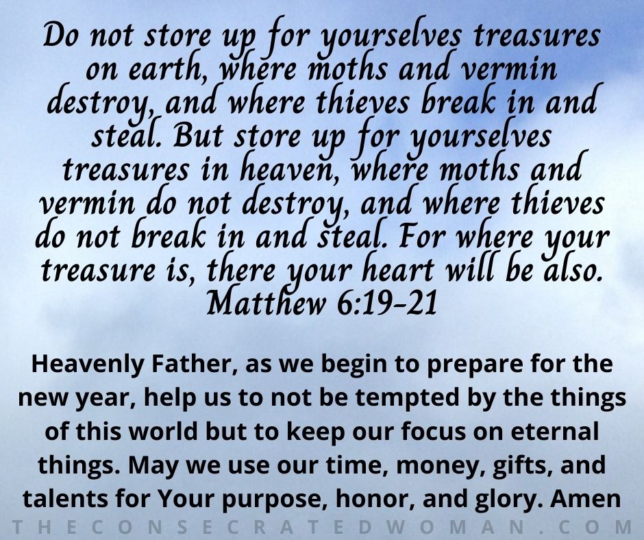 Heavenly Father, as we begin to prepare for the new year, help us to not be tempted by the things of this world but to keep our focus on eternal things. May we use our time, money, gifts, and talents for Your purpose, honor, and glory. Amen