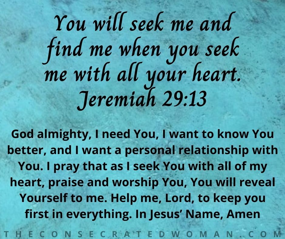 God almighty, I need You, I want to know You better, and I want a personal relationship with You. I pray that as I seek You with all of my heart, praise and worship You, You will reveal Yourself to me. Help me, Lord, to keep you first in everything. In Jesus’ Name, Amen