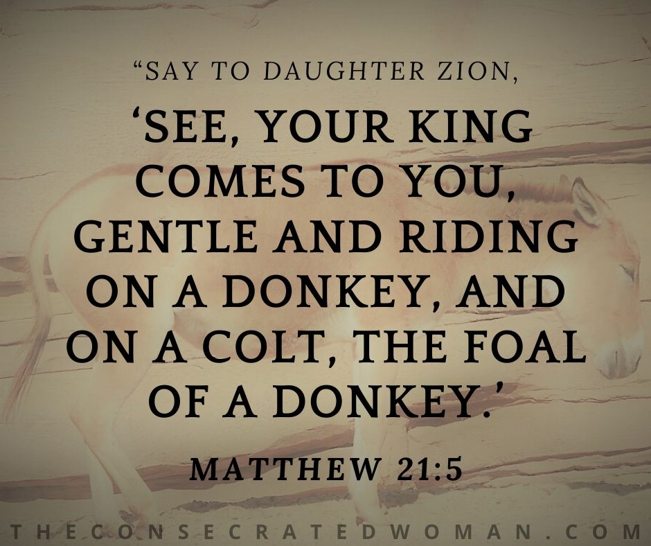 1 As they approached Jerusalem and came to Bethphage on the Mount of Olives, Jesus sent two disciples, 2 saying to them, “Go to the village ahead of you, and at once you will find a donkey tied there, with her colt by her. Untie them and bring them to me. 3 If anyone says anything to you, say that the Lord needs them, and he will send them right away.” 4 This took place to fulfill what was spoken through the prophet: 5 “Say to Daughter Zion, ‘See, your king comes to you, gentle and riding on a donkey, and on a colt, the foal of a donkey.’ ” 6 The disciples went and did as Jesus had instructed them. 7 They brought the donkey and the colt and placed their cloaks on them for Jesus to sit on. 8 A very large crowd spread their cloaks on the road, while others cut branches from the trees and spread them on the road. 9 The crowds that went ahead of him and those that followed shouted, “Hosanna to the Son of David!” “Blessed is he who comes in the name of the Lord!” “Hosanna in the highest heaven!” 10 When Jesus entered Jerusalem, the whole city was stirred and asked, “Who is this?” 11 The crowds answered, “This is Jesus, the prophet from Nazareth in Galilee.”