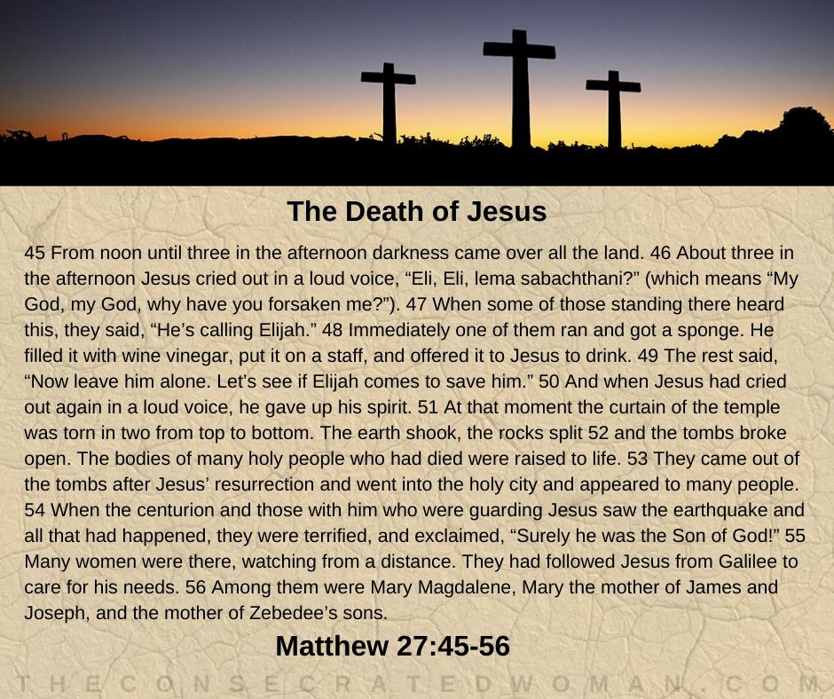 45 From noon until three in the afternoon darkness came over all the land. 46 About three in the afternoon Jesus cried out in a loud voice, “Eli, Eli, lema sabachthani?” (which means “My God, my God, why have you forsaken me?”). 47 When some of those standing there heard this, they said, “He’s calling Elijah.” 48 Immediately one of them ran and got a sponge. He filled it with wine vinegar, put it on a staff, and offered it to Jesus to drink. 49 The rest said, “Now leave him alone. Let’s see if Elijah comes to save him.” 50 And when Jesus had cried out again in a loud voice, he gave up his spirit. 51 At that moment the curtain of the temple was torn in two from top to bottom. The earth shook, the rocks split 52 and the tombs broke open. The bodies of many holy people who had died were raised to life. 53 They came out of the tombs after Jesus’ resurrection and went into the holy city and appeared to many people. 54 When the centurion and those with him who were guarding Jesus saw the earthquake and all that had happened, they were terrified, and exclaimed, “Surely he was the Son of God!” 55 Many women were there, watching from a distance. They had followed Jesus from Galilee to care for his needs. 56 Among them were Mary Magdalene, Mary the mother of James and Joseph, and the mother of Zebedee’s sons.