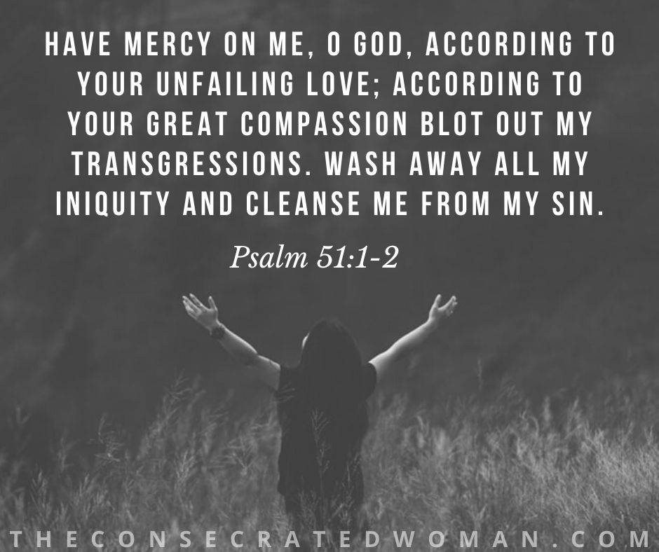 Have mercy on me, O God, according to your unfailing love; according to your great compassion blot out my transgressions. Wash away all my iniquity and cleanse me from my sin.