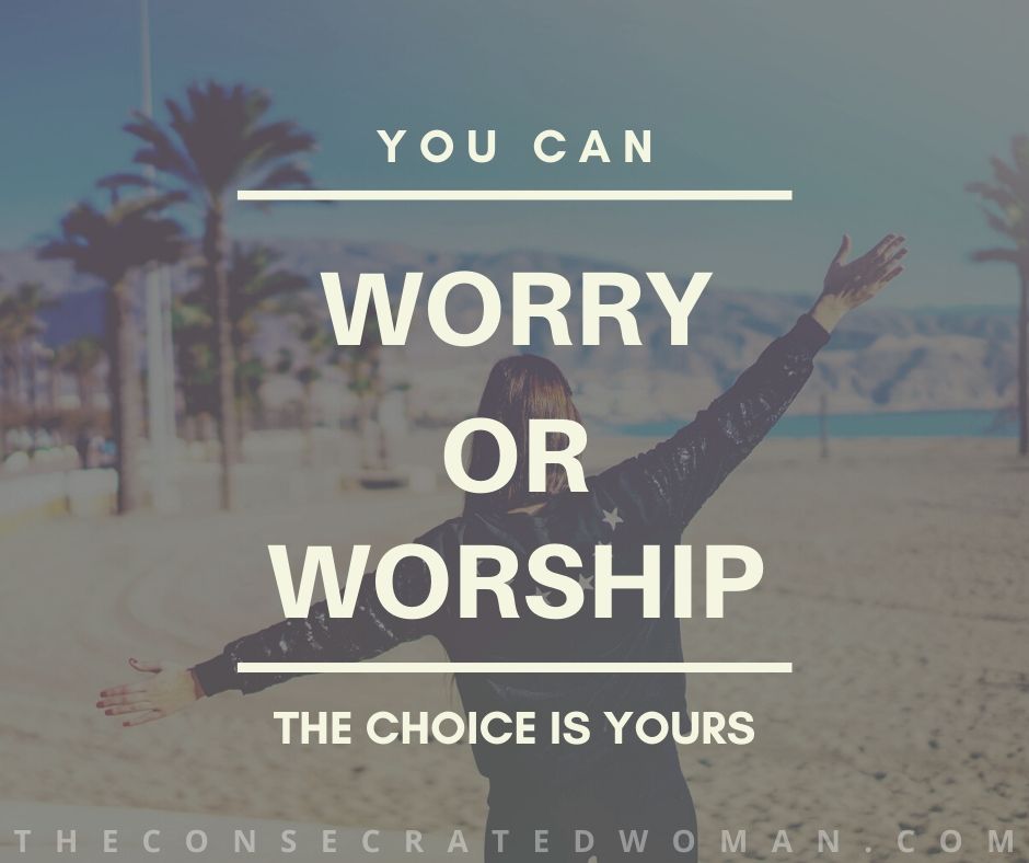Whatever it is that worries you whether it’s spiritual, physical, for yourself or for someone else bring it to God in prayer. Humbly come before your heavenly Father with a sincere heart and lay your burdens, your worries and your cares at His feet. Thank Him for what He’s done for you in the past, thank Him for hearing your prayer in the present and thank Him in advance for answering your prayer in the future. Come to Him with an honest heart, tell Him how you feel and what you need. He already knows, but He wants to hear it from you. The choice is yours, you can worry or you can worship but you can’t do both.
