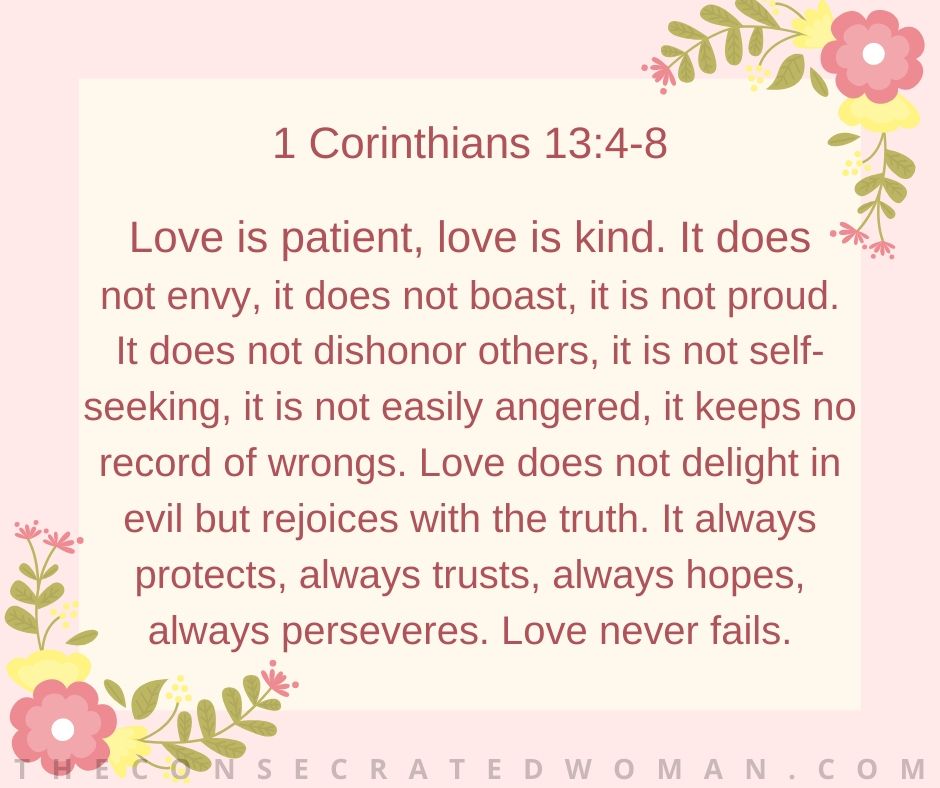 Fruit of the Spirit: Love is Patient and Kind; Love does not envy or boast; it is not arrogant or rude. It does not insist on its own way; it is not irritable or resentful; it does not rejoice at wrongdoing, but rejoices with the truth. Love bears all things, believes all things, hopes all things, endures all things. Love is much more than a feeling; it is a choice.