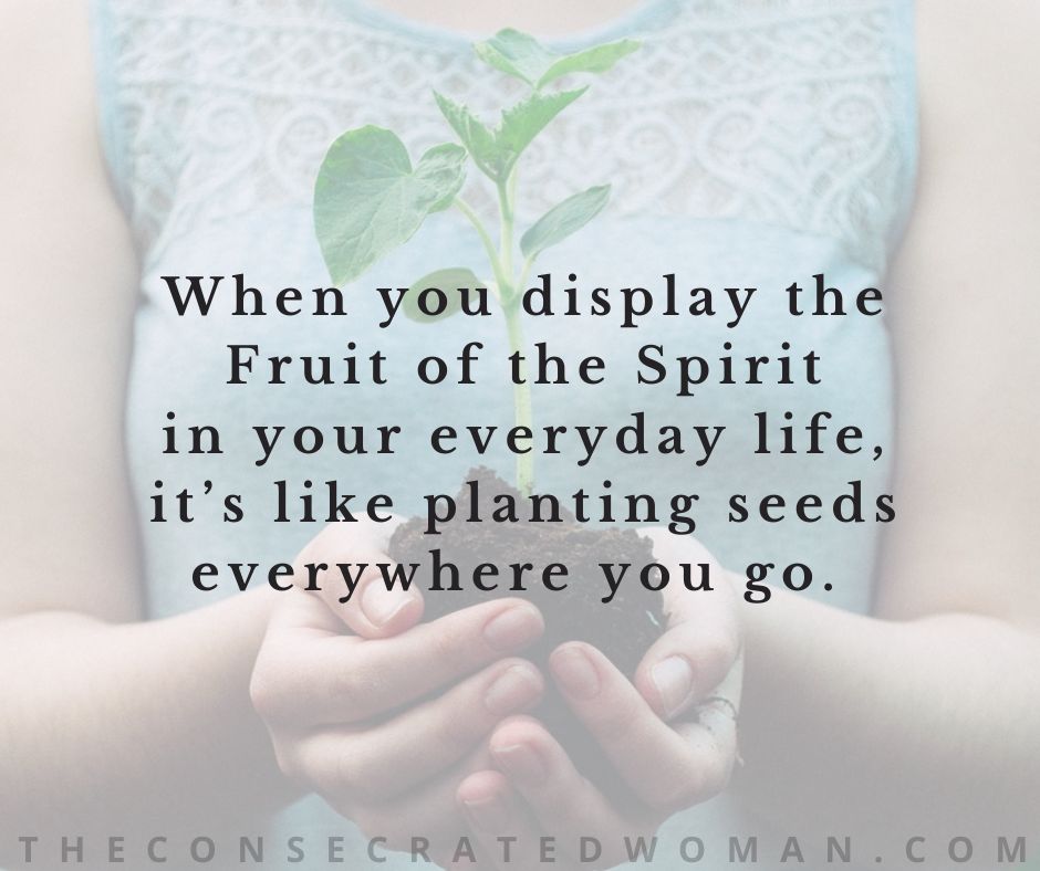 Fruit of the Spirit: When you display the Fruit of the Spirit in your everyday life, it’s like planting seeds everywhere you go. Be Loving, Joyful, Peaceful, Patient, Kind, Good, Faithful, Gentle, and Self-controlled and let the seeds of the Fruit fall where they may.