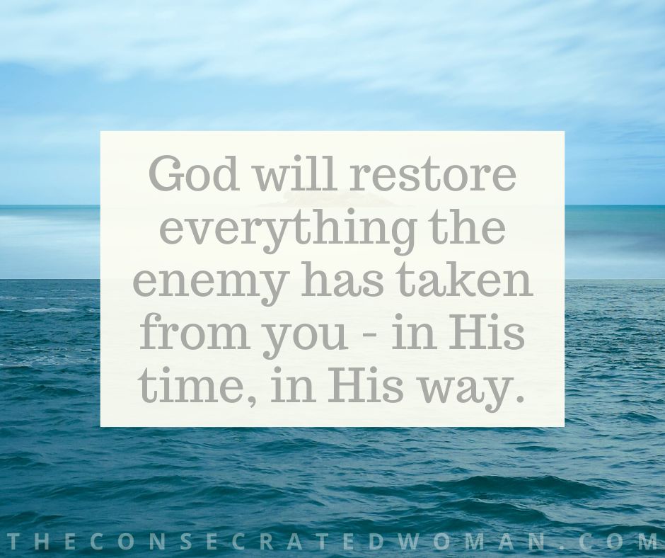 Fruit of the Spirit: God will restore you and turn your sorrow into Joy, your brokenness into beauty, your wailing into dancing. Have Faith that God is able to change your circumstances and in His timing, He will restore everything the enemy has taken from you.