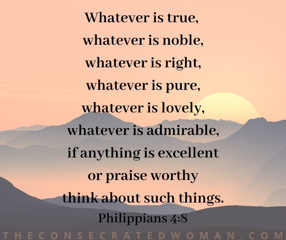 Whatever is true, whatever is noble, whatever is right, whatever is pure, whatever is lovely, whatever is admirable, if anything is excellent or praise worthy think about such things.