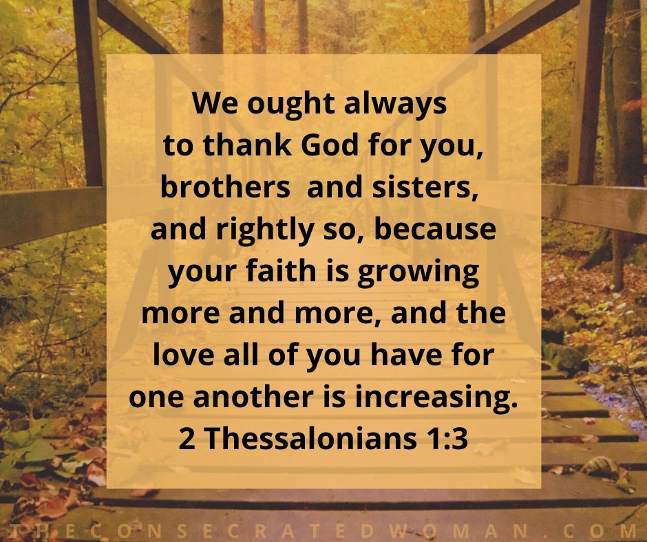 We ought always to thank God for you, brothers and sisters, and rightly so, because your faith is growing more and more, and the love all of you have for one another is increasing.