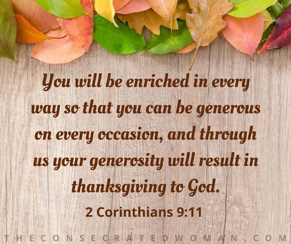 You will be enriched in every way so that you can be generous on every occasion, and through us your generosity will result in thanksgiving to God.