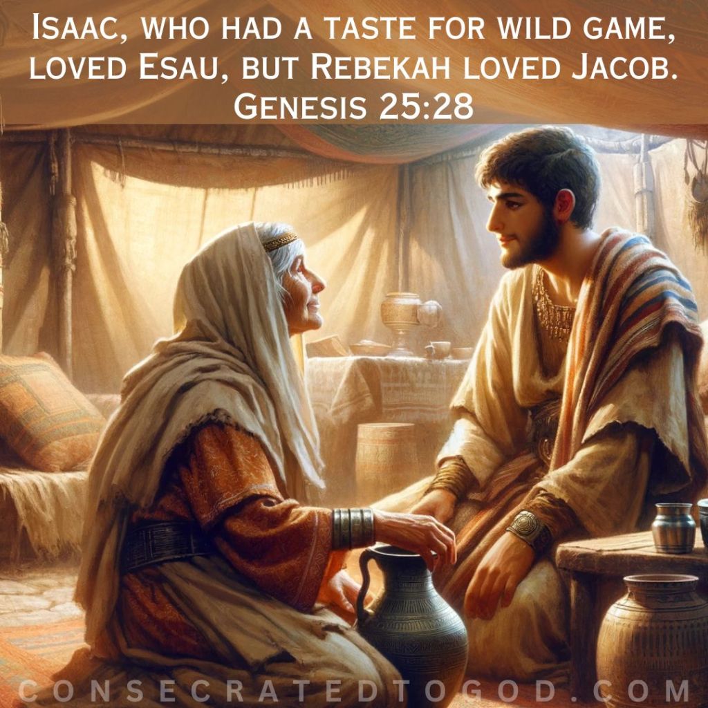Isaac, who had a taste for wild game, loved Esau, but Rebekah loved Jacob.