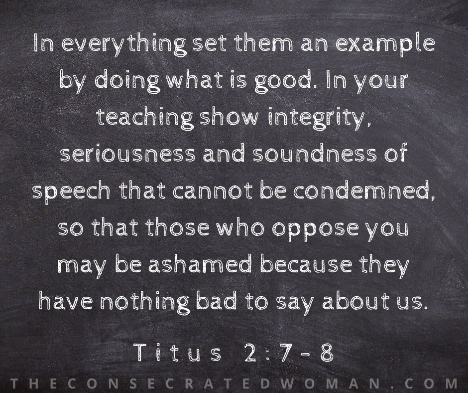 In everything set them an example by doing what is good. In your teaching show integrity, seriousness and soundness of speech that cannot be condemned, so that those who oppose you may be ashamed because they have nothing bad to say about us.