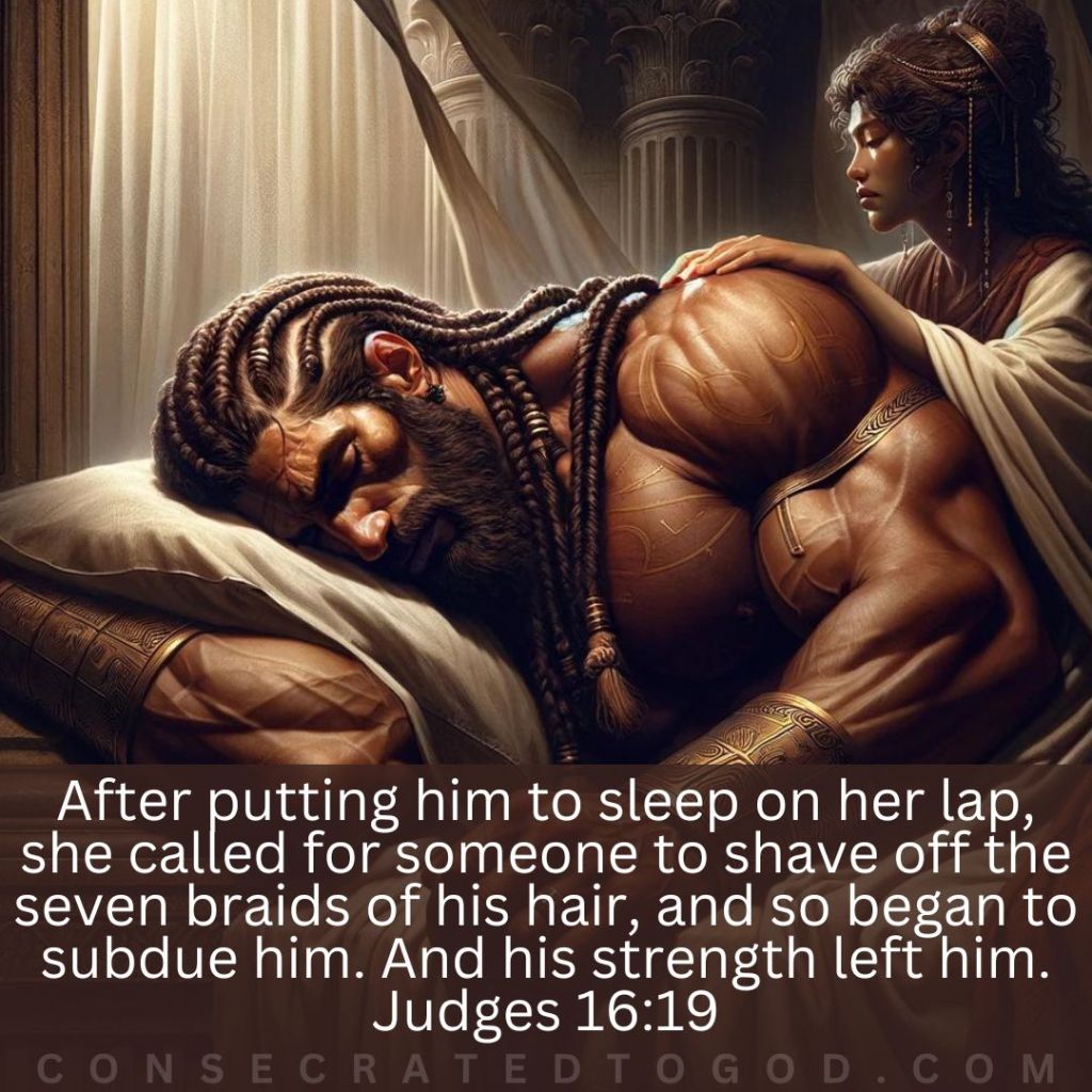After putting him to sleep on her lap, she called for someone to shave off the seven braids of his hair, and so began to subdue him. And his strength left him.