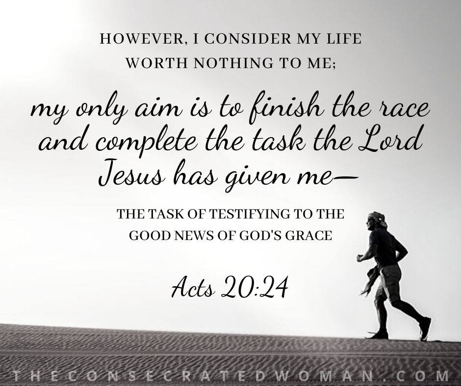 However, I consider my life worth nothing to me; my only aim is to finish the race and complete the task the Lord Jesus has given me—the task of testifying to the good news of God’s grace.