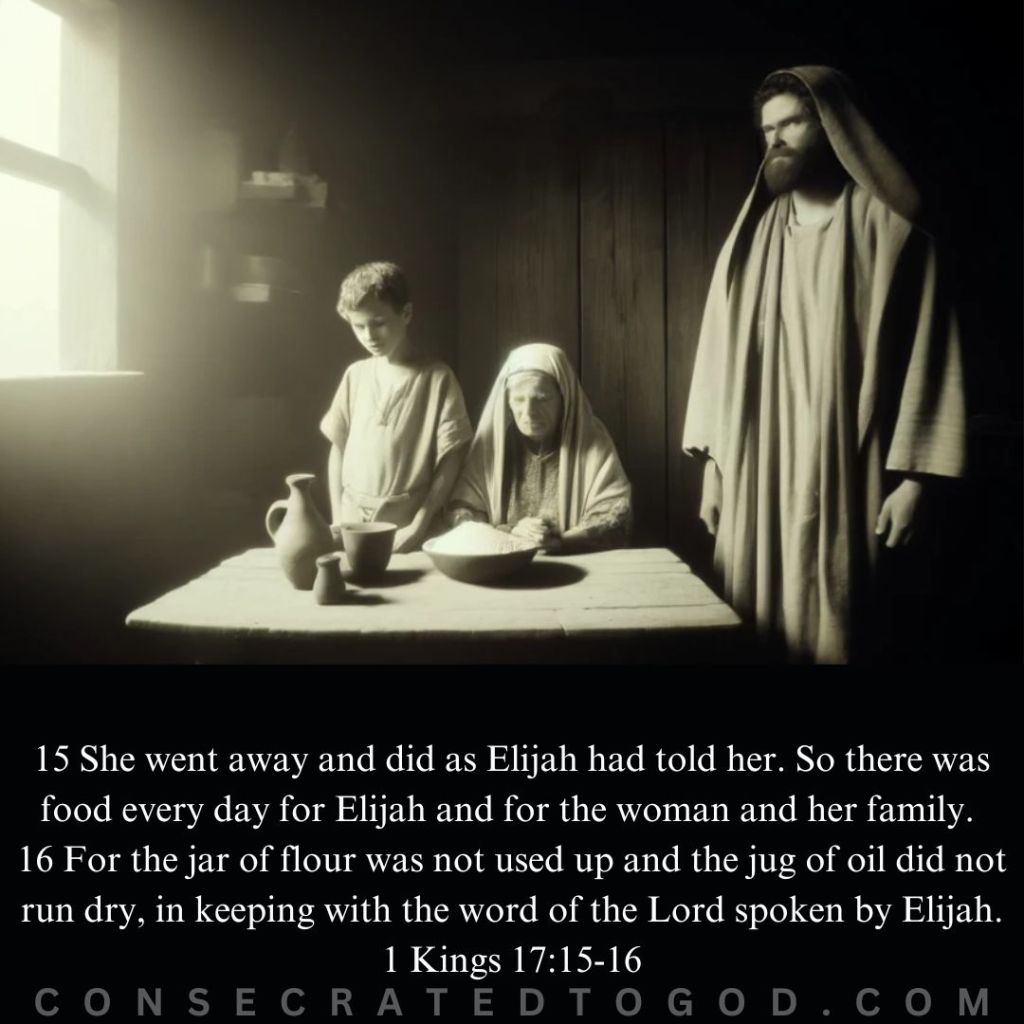 15 She went away and did as Elijah had told her. So there was food every day for Elijah and for the woman and her family. 16 For the jar of flour was not used up and the jug of oil did not run dry, in keeping with the word of the Lord spoken by Elijah.