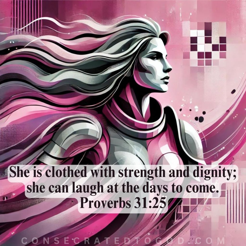 A Proverbs 31:25 woman demonstrates both physical and emotional strength. Her strength is evident in her ability to support and nurture her family, pursue her passions, and stand firm in her beliefs. This strength is derived from her faith and trust in God, giving her the resilience to overcome life’s challenges. She conducts herself with integrity and grace, no matter the circumstances. She treats others with kindness and respect. Her dignity is not dependent on the validation of others but is rooted in her understanding of her value as a beloved child of God. She is not anxious about the future because she places her trust in God and in His plan. Her confidence stems from her faith, which assures her that she is never alone and that she is capable of handling whatever comes her way. This trust allows her to face the future with a positive outlook and a joyful heart, knowing that God is in control. The Proverbs 31:25 woman is a role model, a leader, and a support for her family and friends. Her life is a journey of constant growth in faith as she actively seeks to deepen her relationship with God through prayer, study, and service.