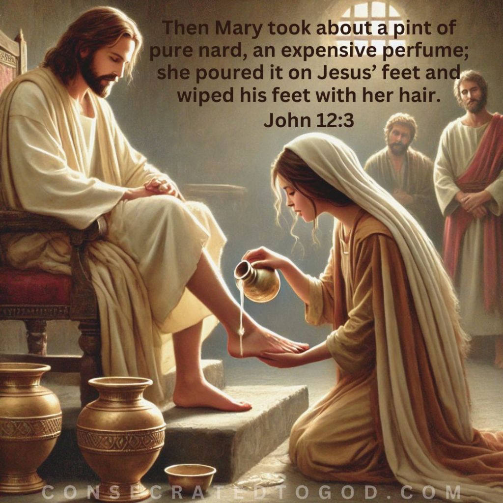 Then Mary took about a pint of pure nard, an expensive perfume; she poured it on Jesus’ feet and wiped his feet with her hair.