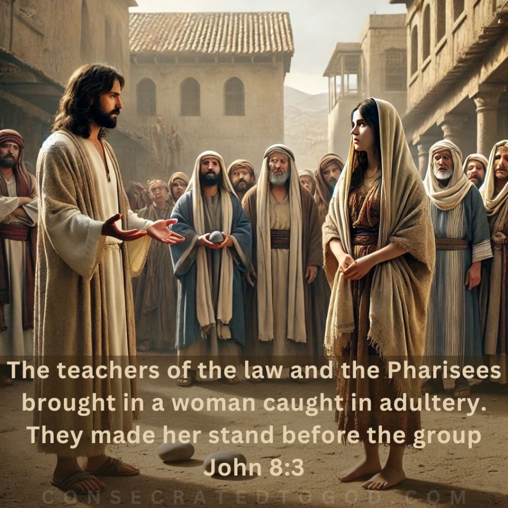 The teachers of the law and the Pharisees brought in a woman caught in adultery. They made her stand before the group