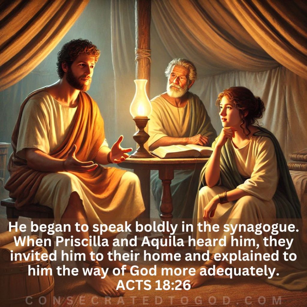 He began to speak boldly in the synagogue. When Priscilla and Aquila heard him, they invited him to their home and explained to him the way of God more adequately.