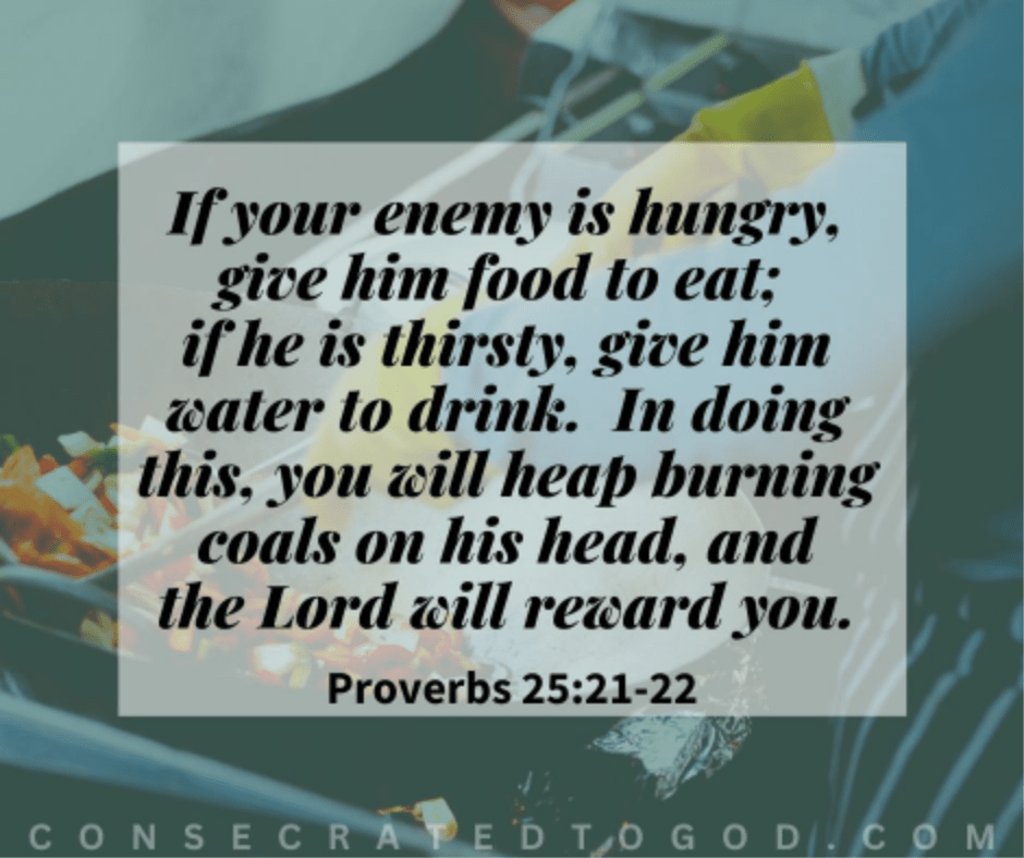 Have you ever heard the expression “kill them with kindness”? It means to put an end to anger and bitterness by showing kindness and generosity. As metals are melted by heaping coals upon them, so is the heart softened by kindness. (Jamieson-Fausset-Brown Bible Commentary) By consistently treating your enemies with unexpected kindness and generosity, they are more likely to witness the same love, forgiveness, mercy, and grace that the Lord extends to you. Demonstrating kindness, even to those who may not deserve it, not as a reflection of their character, but a testament to your own.