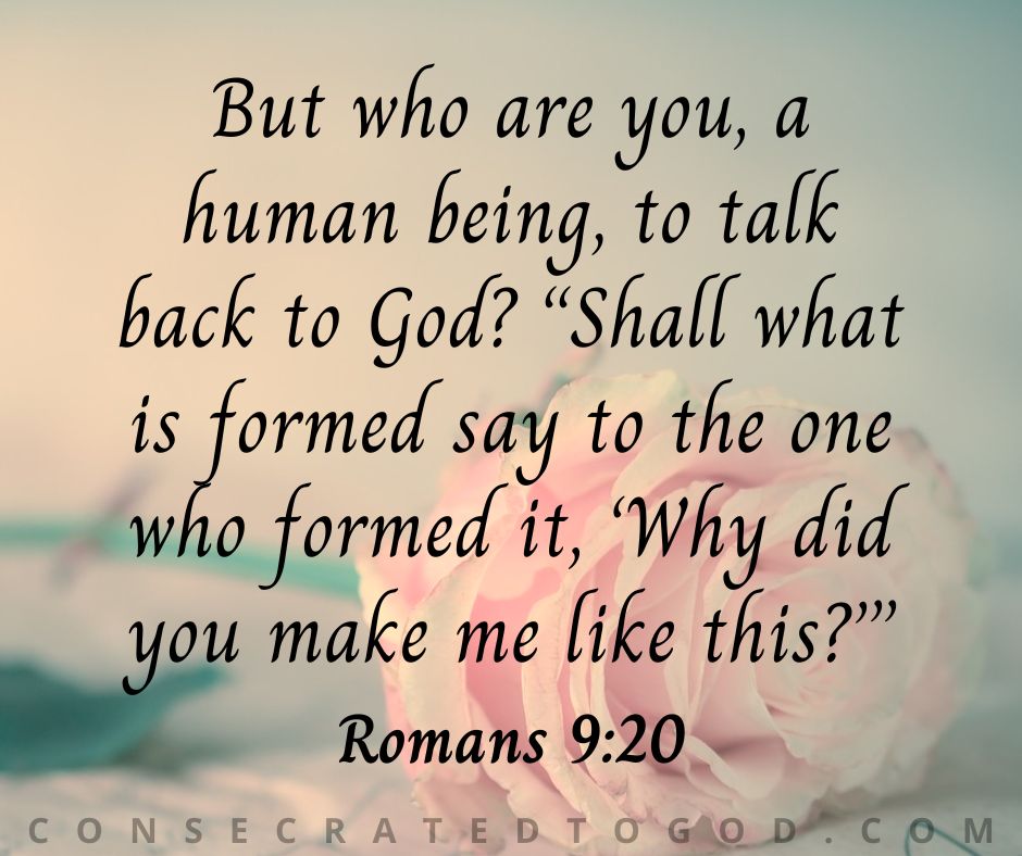 But who are you, a human being, to talk back to God? “Shall what is formed say to the one who formed it, ‘Why did you make me like this?”