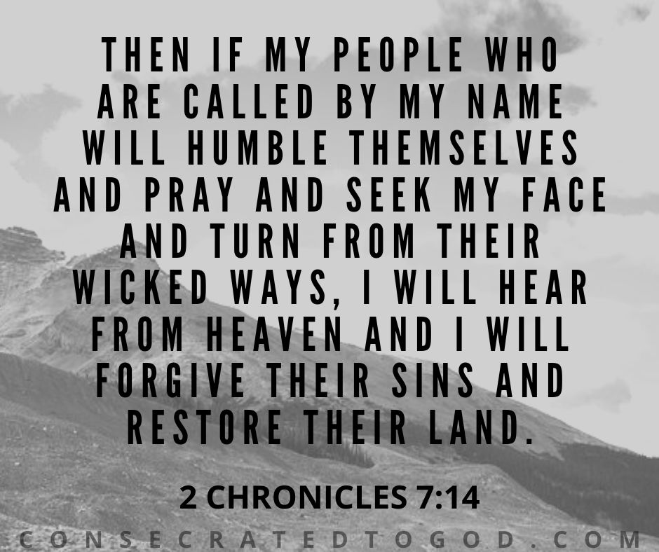 Then if my people who are called by my name will humble themselves and pray and seek my face and turn from their wicked ways, I will hear from heaven and I will forgive their sins and restore their land.