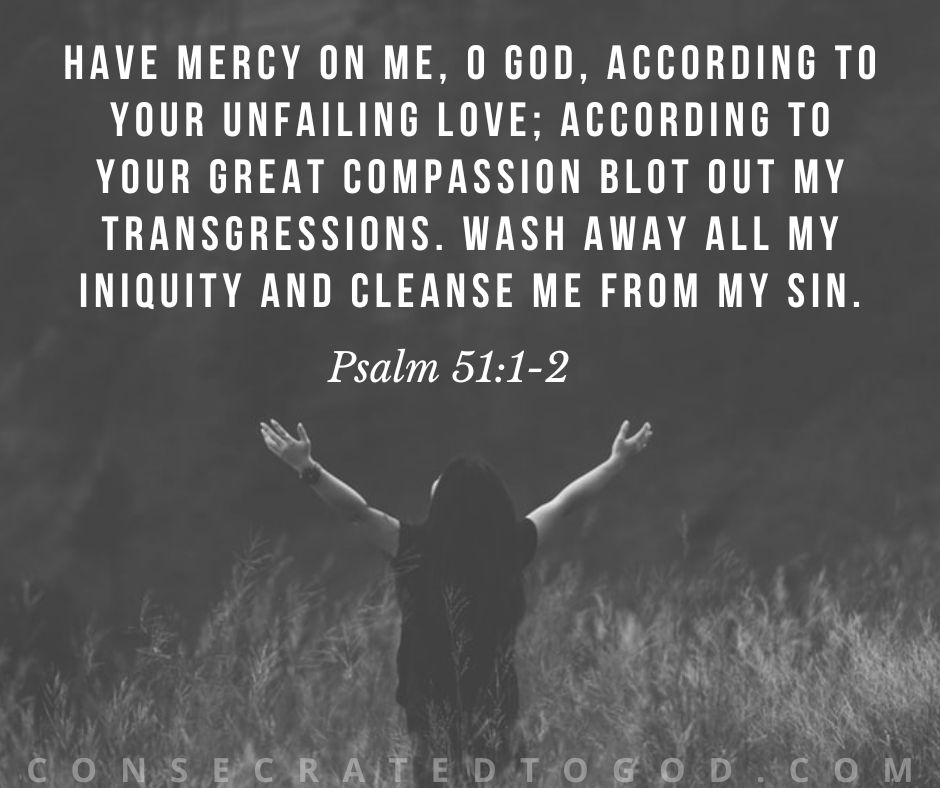 Have mercy on me, O God, according to your unfailing love; according to your great compassion blot out my transgressions. Wash away all my iniquity and cleanse me from my sin.