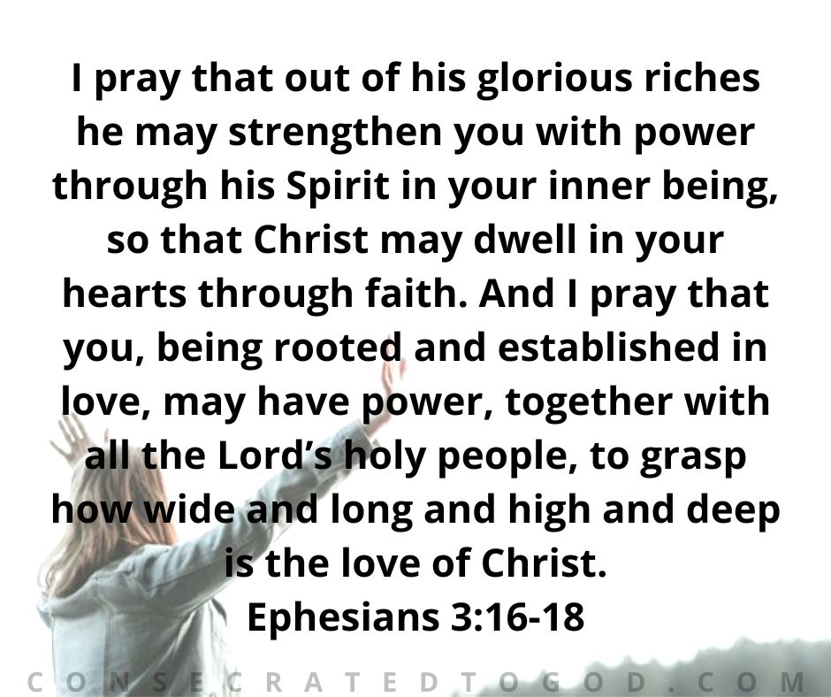 I pray that out of his glorious riches he may strengthen you with power through his Spirit in your inner being, so that Christ may dwell in your hearts through faith. And I pray that you, being rooted and established in love, may have power, together with all the Lord’s holy people, to grasp how wide and long and high and deep is the love of Christ.