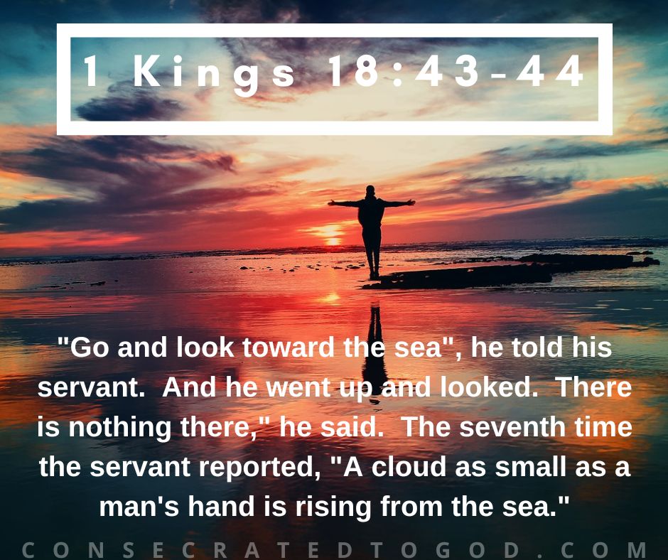 “Go and look toward the sea”, he told his servant. And he went up and looked. There is nothing there,” he said. The seventh time the servant reported, “A cloud as small as a man’s hand is rising from the sea.”