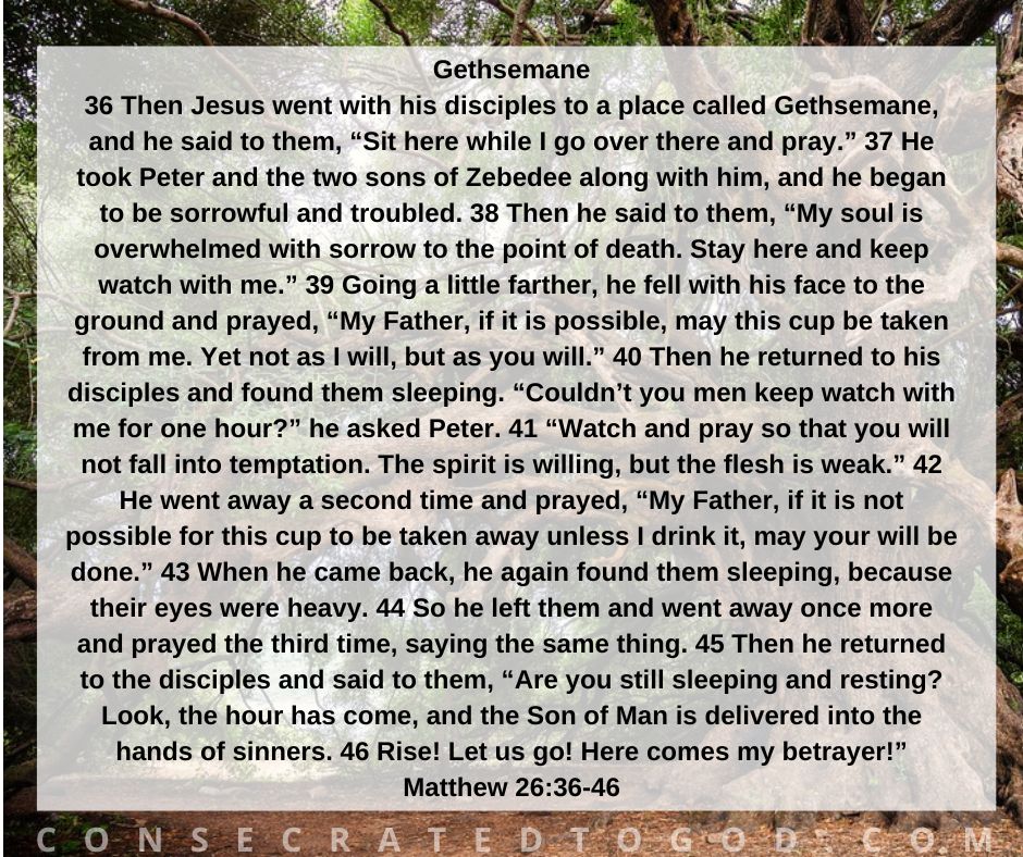 36 Then Jesus went with his disciples to a place called Gethsemane, and he said to them, “Sit here while I go over there and pray.”