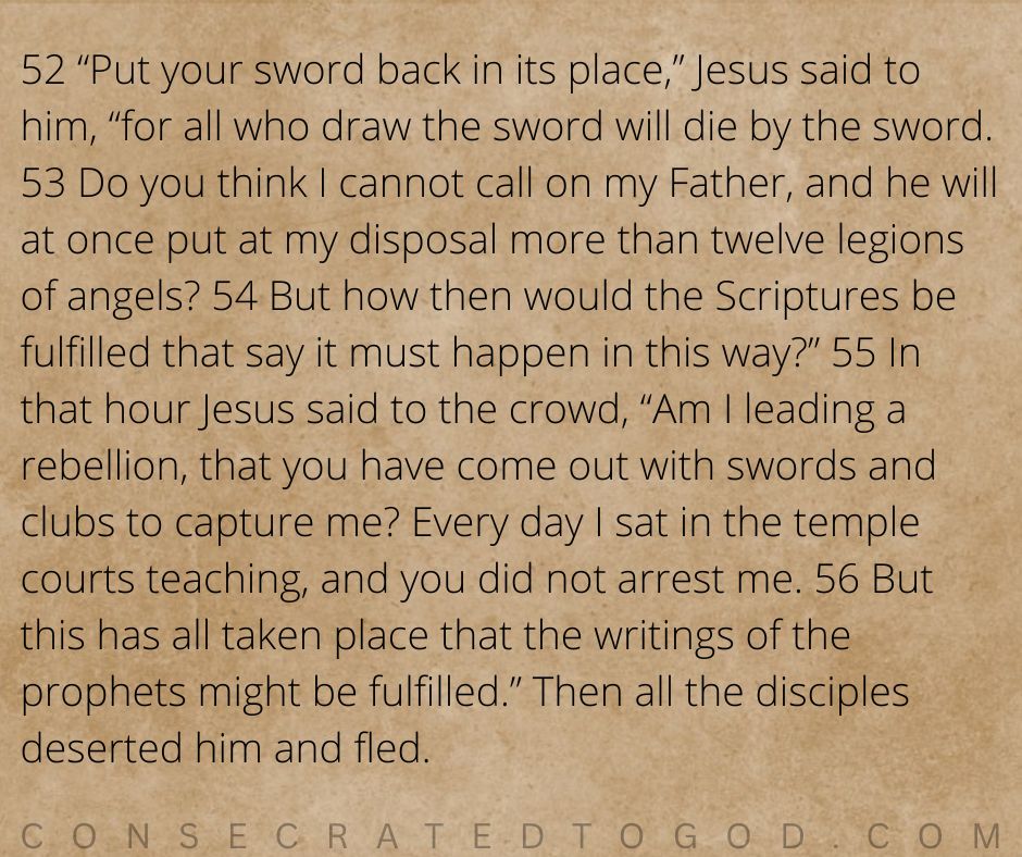 52 “Put your sword back in its place,” Jesus said to him, “for all who draw the sword will die by the sword. 53 Do you think I cannot call on my Father, and he will at once put at my disposal more than twelve legions of angels? 54 But how then would the Scriptures be fulfilled that say it must happen in this way?”